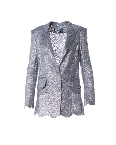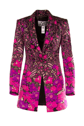 Classic evening coat in a luxurious, textured, French tassel brocade. Features a hook and eye closure with Preciosa crystal elements.