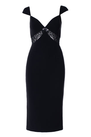 This classic dress is embellished with pearls and features a cut-out with lace insert. The pleated, cap-sleeves broaden the shoulder, and with the inverted cut-out, broaden's the shoulders and accentuates the waist. The pearl embellishment can be tonal or you can place a special request to have them done in a contrast colour. This dress can also be ordered long.